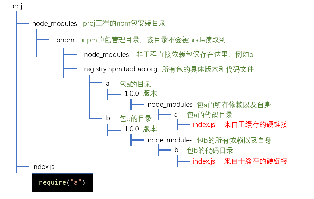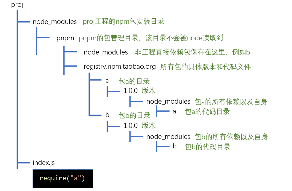 假设我们的工程为 proj,直接依赖 a,则安装时,pnpm 会做下面的处理