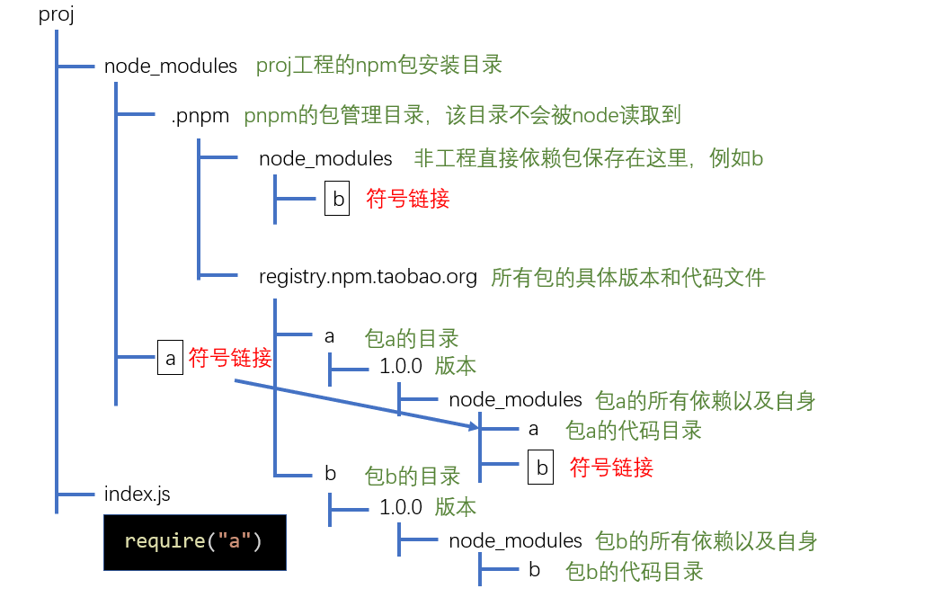 - 使用符号链接,将每个包的直接依赖放置到自己的目录中