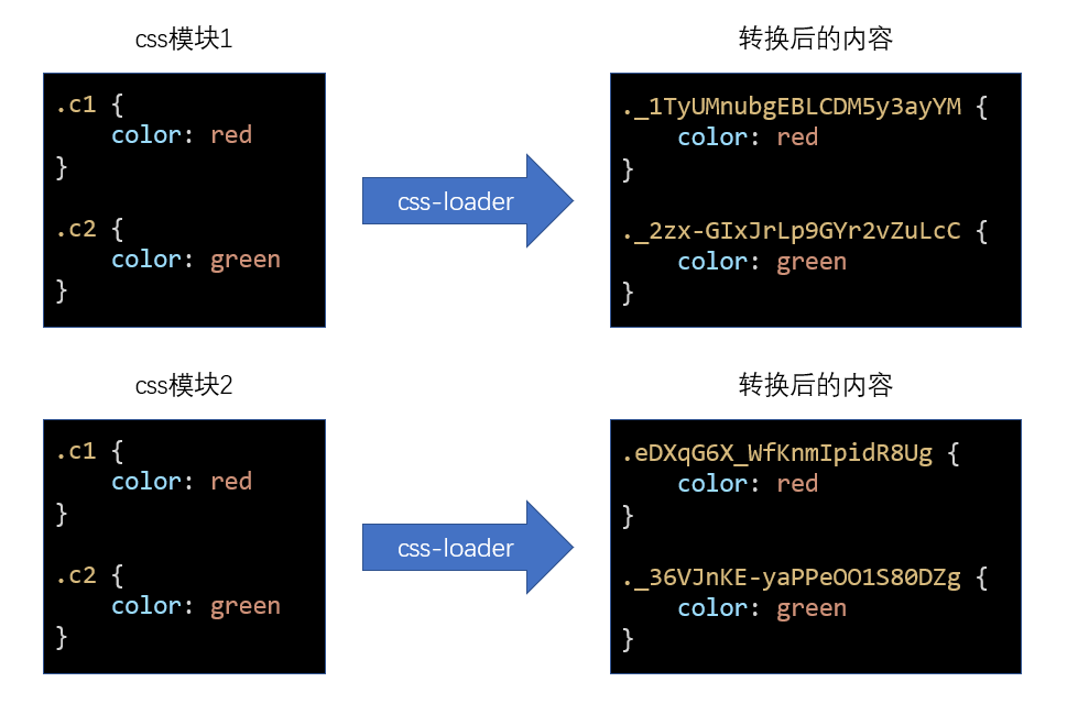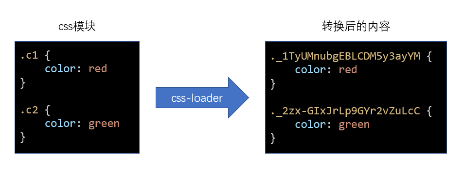 1.css-loader内部实现了css module的规范,只需要给css-loader配置项开启modules选项