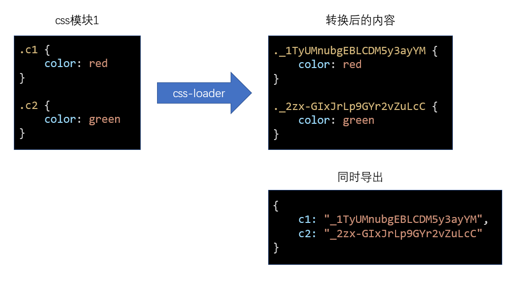 为了解决这个问题,css-loader 会导出原类名和最终类名的对应关系,该关系是通过一个对象描述的