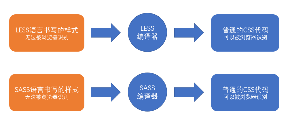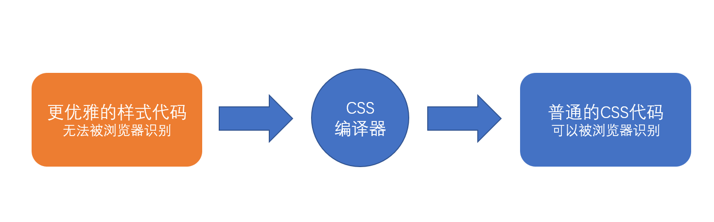 预编译器的原理很简单,即使用一种更加优雅的方式来书写样式代码,通过一个编译器,将其转换为可被浏览器识别的传统 css 代码