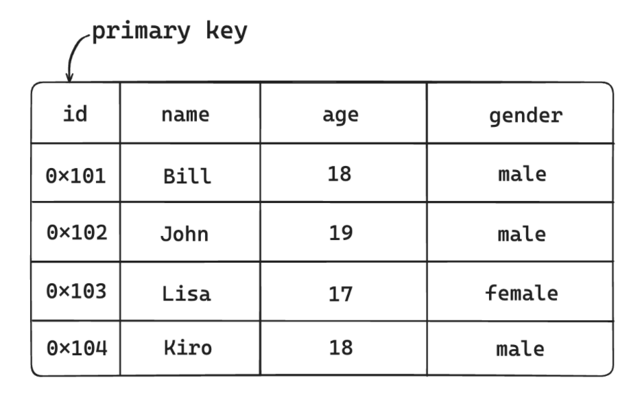 在关系型数据库中,primary key 用于标记这条数据的唯一性,因此在上表中只有 id 这个字段能够作为主键,另外 3 个字段都不行。