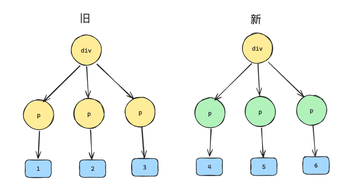 通过观察我们发现,VNode 的变化,仅仅是 p 元素的子节点(文本节点)发生变化,p 元素本身其实没有任何的变化。因此最为理想的做法是更新这个 3 个 p 元素的文本节点内容,这样只会涉及到 3 次 DOM 操作,性能提升一倍。