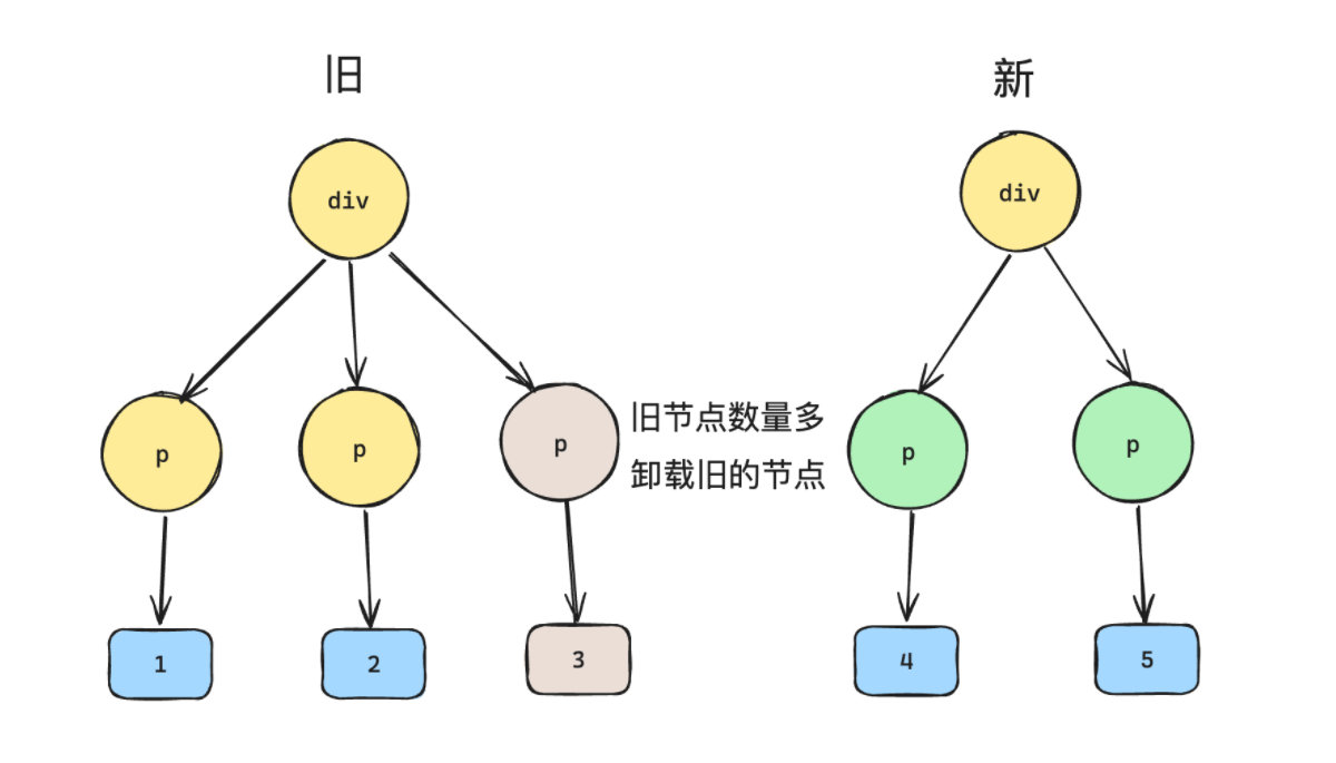- 卸载所有旧的子节点,需要 3 次 DOM 的删除操作